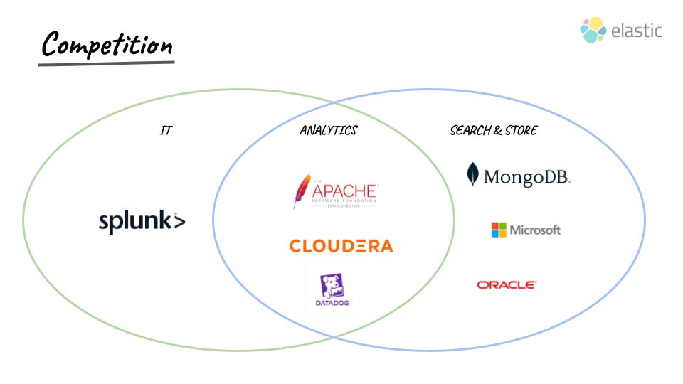 On the analytics and data store side, Elastic competes with Cloudera (CLDR), Datadog, and others.