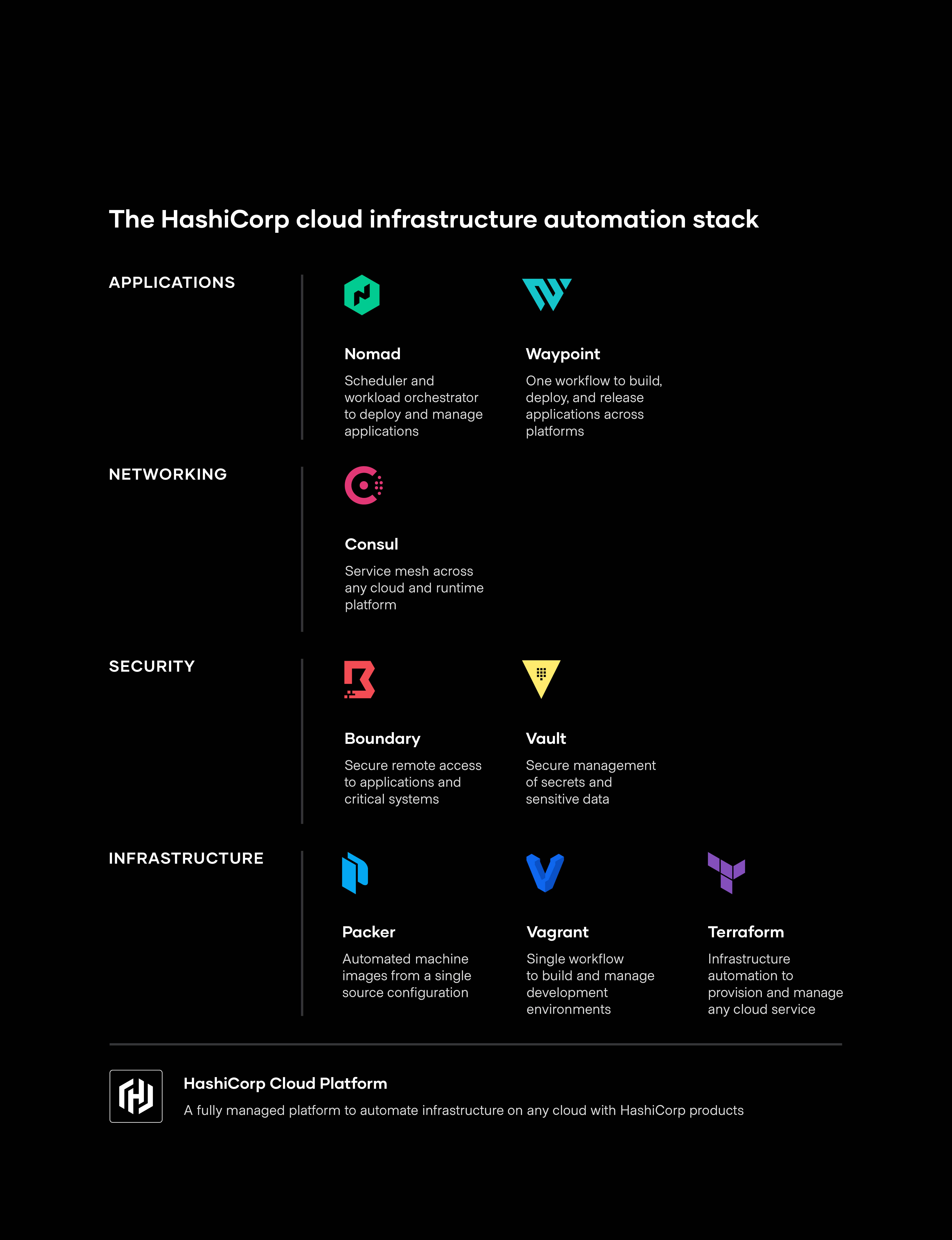 Packer, Vagrent, Boundary, and Nomad round out the product suite. These can be used individually or all together.
