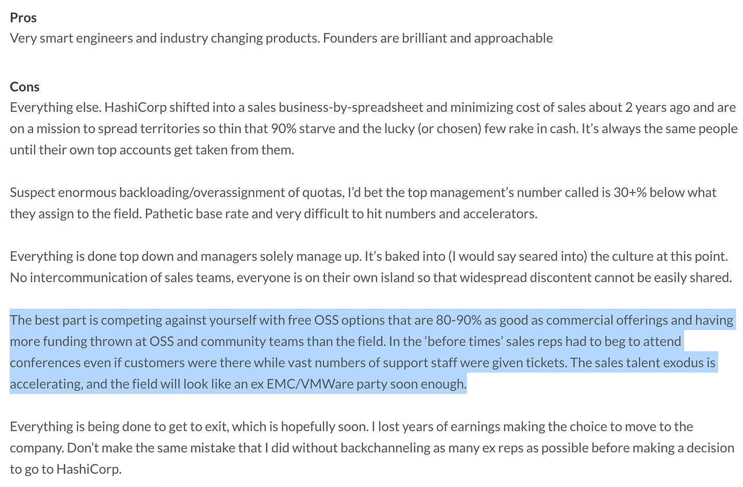 Being shielded from the CSPs is good, but there is nothing preventing an organization from building on top of HCPs open source products and monetizing. HCP will have to compete with copy cats in this space like harness.io and env0.com which offer IaC as a service, Terraform Cloud like solutions. Building on top of an OSS and monetizing is a double edged sword, on one hand you don’t need to spend the resources to develop your own solution, but on the other hand you will always be a step behind the OSS maintainer, and the maintainer will always be viewed as the experts.