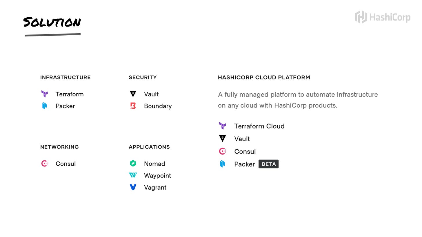 HashiCorp is probably most well known for creating Terraform, an infrastructure provisioning tool. Simply put Terraform allows you to script the resources and configuration needed to run in the cloud. This helps solve the problem of provisioning digital resources by arming administrators with one interface that works across multiple cloud platforms.