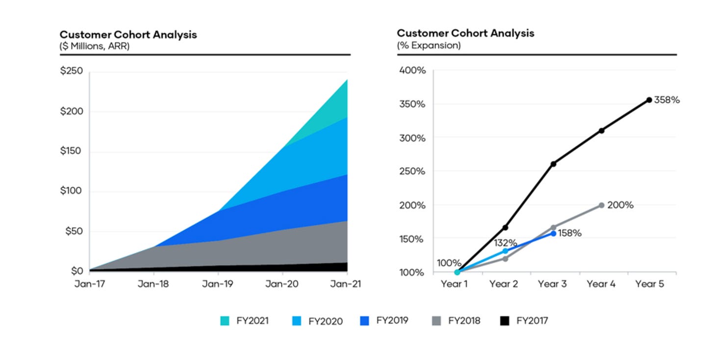 HashiCorp practices an “adopt, land, expand, and extend motion” with is customers. That means that they expand on new customers scaling their usage. They traditionally experience significant expansion with a customer after the initial acquisition. This creates a non linear relation ship with earnings to customers. So as they acquire more customers earnings should grow exponentially. The charts below illustrate this expansion. The one on the left shows growth in total Annual Recurring Revenue (ARR) for a given set of customers acquired in a certain year. The one on the right shows percentage growth in spending from a given set of customers by year.